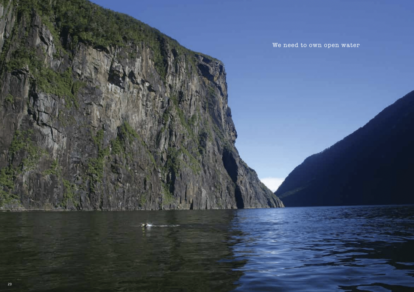 Blueseventy needed to own open water swimming. Geoff Matthews pictured here swimming across Milford Sound to get images for global marketing collateral